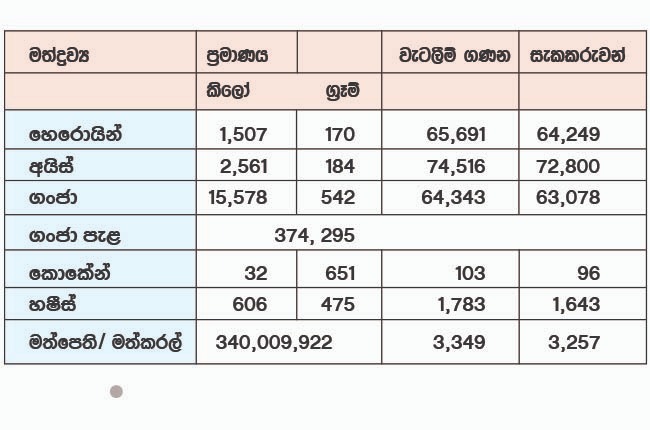 මෙම වසරේ ජනවාරි 1 සිට ඊයේ (12) දක්වා කළ වැටලීම්වලින් හෙරොයින් සහ අයිස් මත්ද්රව්ය ටොන් 4කට අධික ප්රමාණයක් සොයාගැනීමට පොලීසිය ඇතුළු ආරක්ෂක අංශ සමත්ව ඇත. මෙම මත්ද්රව්යවල වීදි වටිනාකම රුපියල් කෝටි 5,000කට අධික වේ.