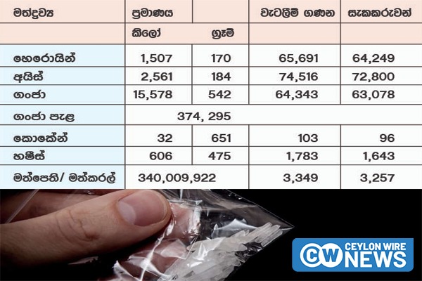 මෙම වසරේ ජනවාරි 1 සිට ඊයේ (12) දක්වා කළ වැටලීම්වලින් හෙරොයින් සහ අයිස් මත්ද්රව්ය ටොන් 4කට අධික ප්රමාණයක් සොයාගැනීමට පොලීසිය ඇතුළු ආරක්ෂක අංශ සමත්ව ඇත. මෙම මත්ද්රව්යවල වීදි වටිනාකම රුපියල් කෝටි 5,000කට අධික වේ.