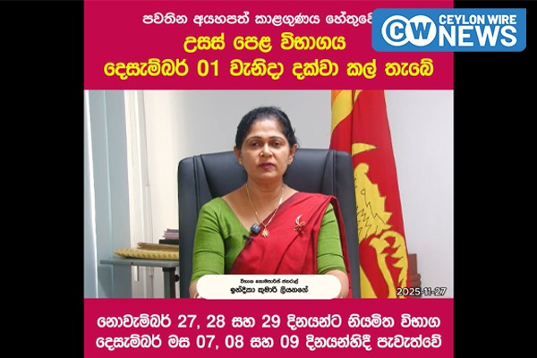 මේ වන විට දිවයිනට බලපා ඇති අයහපත් කාලගුණ තත්වය හේතුවෙන්, ප්‍රදේශ රැසකට බලපා ඇති ආපදා තත්වය පිළිබඳ සලකා බලා නොවැම්බර් 27 (අද) සිට නොවැම්බර් 28 (හෙට) සහ නොවැම්බර් 29 (සෙනසුරාදා) පැවැත්වීමට නියමිත අධ්‍යයන පොදු සහතික පත්‍ර උසස් පෙළ විභාගය එම දිනවල නොපැවැත්වෙන බව විභාග කොමසාරිස් ජනරාල් එස්. ඉන්දිකා කුමාරි ලියනගේ පැවසුවාය.