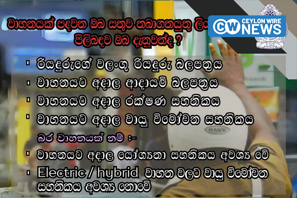 2 years ago Tags #ceylonwire වාහනේ යනකොට පොලිසියට පෙන්නන්න මේවා අරගෙන යන්න මාර්ගයේ ගමන් කරන විට අවශ්ය බලපත්ර සහ ලියකියවිලි රැගෙන යන ලෙස ශ්රී ලංකා පොලිසිය සියලුම රියදුරන්ට සිහිකැඳවීමක් නිකුත් කර තිබේ.