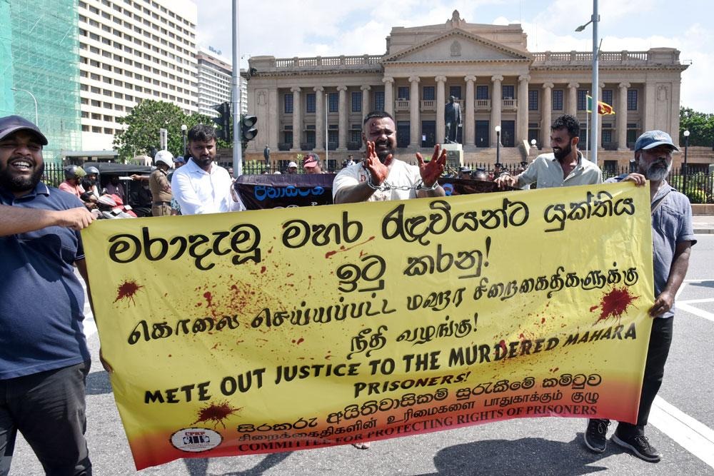 මහර බන්ධනාගාරයේදී ඝාතනයට ලක්වූ සිරකරුවන්ට සාධාරණයක් ඉටුකරන ලෙස ඉල්ලමින් සිරකරුවන්ගේ අයිතීන් සුරැකීමේ කමිටුව කොළඹ කොටුවේ සිට ජනාධිපති ලේකම් කාර්යාලය දක්වා පාගමනින් පැමිණියේය.(Daily Mirror)