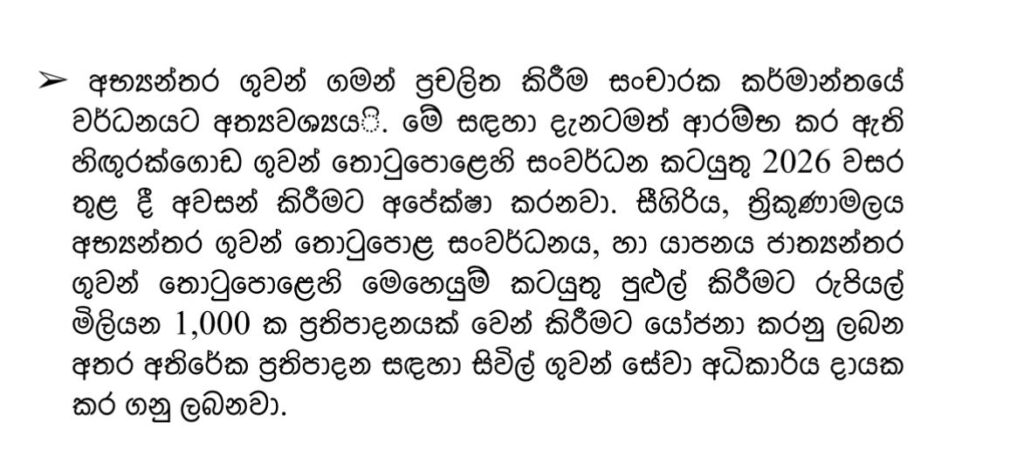 “සීගිරිය සහ ත්රිකුණාමලය අභ්යන්තර ගුවන්තොටුපළ සංවර්ධනය කිරීම සඳහා රුපියල් බිලියනයක් වෙන් කිරීමට සහ යාපනය අන්තර්ජාතික ගුවන්තොටුපළේ මෙහෙයුම් පුළුල් කිරීම සඳහා සිවිල් ගුවන් සේවා අධිකාරිය අතිරේක ප්රතිපාදන සපයනු ඇත,” යනුවෙන් ජනාධිපතිවරයා පැවසීය.