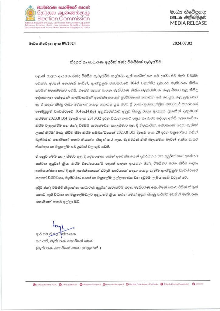 “පළාත් පාලන ආයතනවල ඡන්ද විමසීම කල් දැමීම සහ අසම්පූර්ණ වීම හේතුවෙන් මැතිවරණ නීතිය රට පුරා අඛණ්ඩව ක්‍රියාත්මක වේ,” ආණ්ඩුක්‍රම ව්‍යවස්ථාවේ 104A වගන්තිය සඳහන් කරමින් එම ප්‍රකාශය අවධාරණය කරයි.