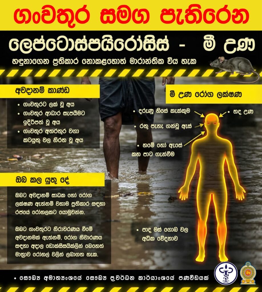 ගංවතුර සමග පැතිරෙන ‘ලෙප්ටොස්පයිරෝසිස්’ (මී උණ) හඳුනාගෙන වහා ප්රතිකාර නොකළහොත් මාරාන්තික වියහැකි බවට සෞඛ්ය අමාත්යංශයේ සෞඛ්ය ප්රවර්ධන කාර්යාංශය අනතුරු අඟවයි.