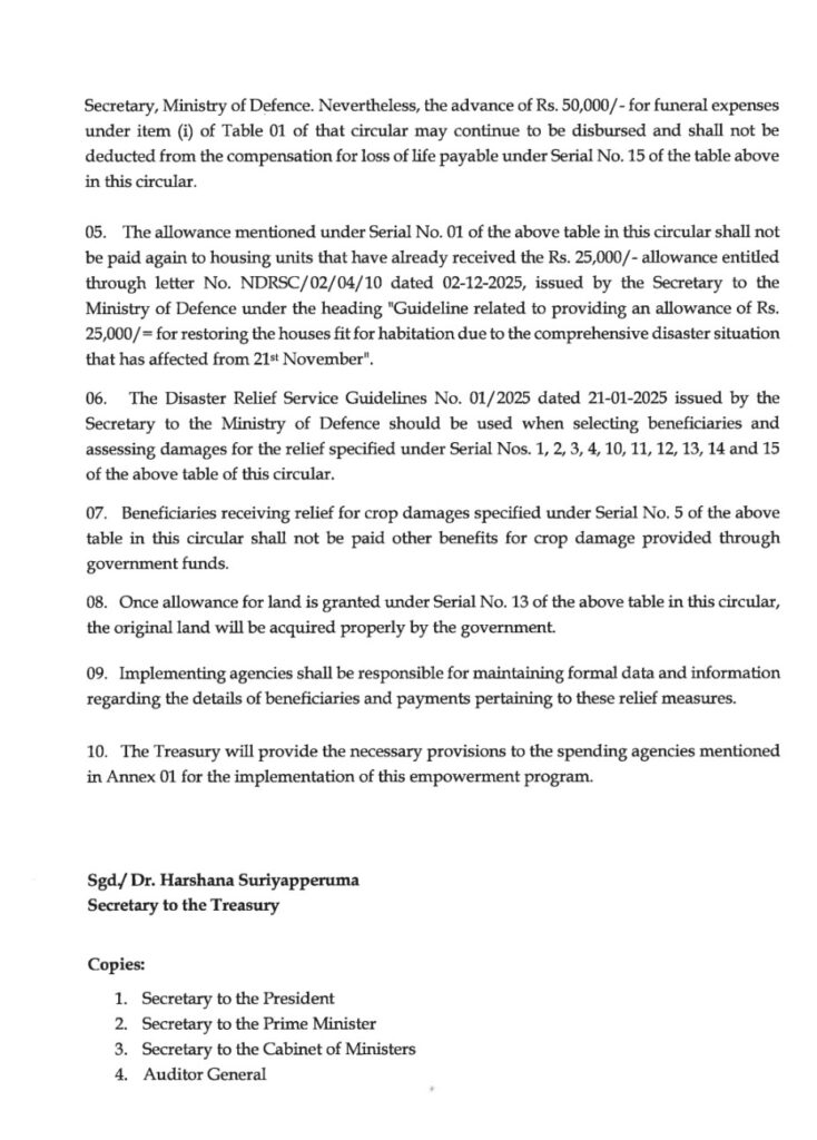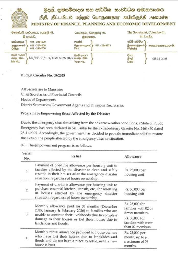 ‘දිත්වා’ සුළිකුණාටු ව්‍යසනයෙන් පීඩාවට පත් පවුල් සඳහා ලබාදෙන මූල්‍ය ආධාර සඳහන් කරමින් මුදල් අමාත්‍යාංශය විසින් අයවැය චක්‍රලේඛ අංක 08/2025 නිකුත් කර ඇත.