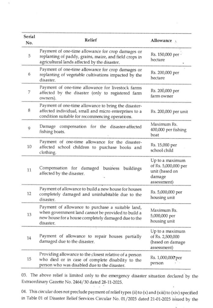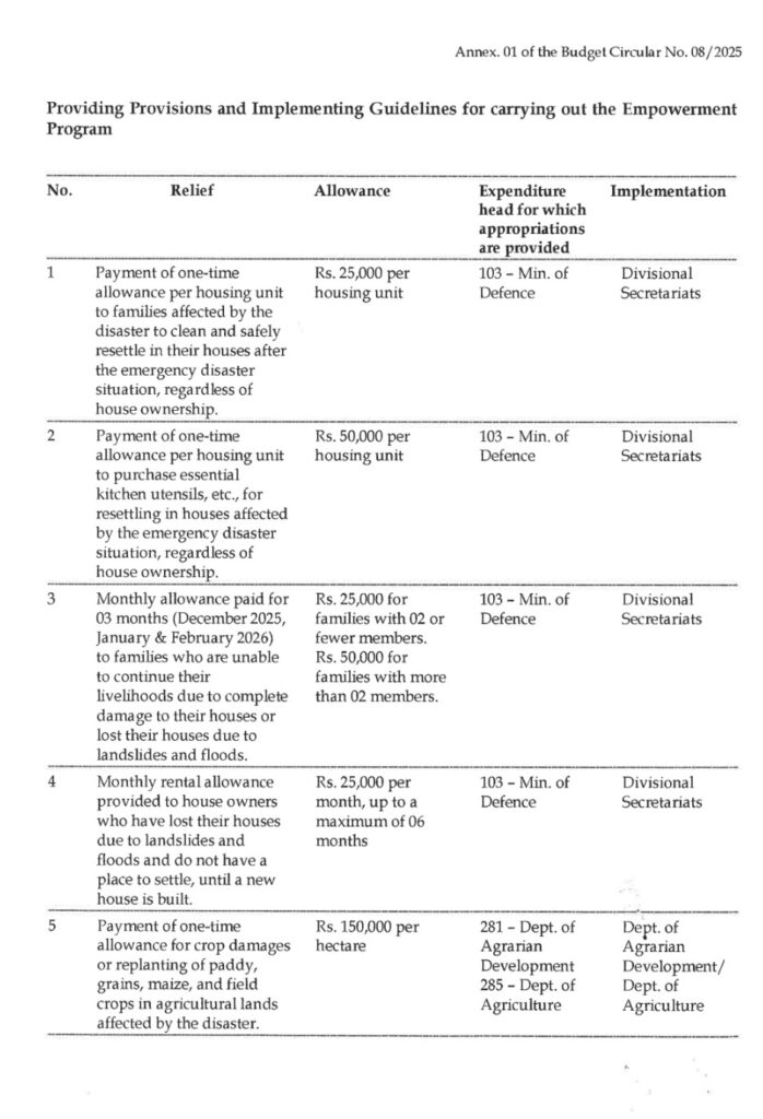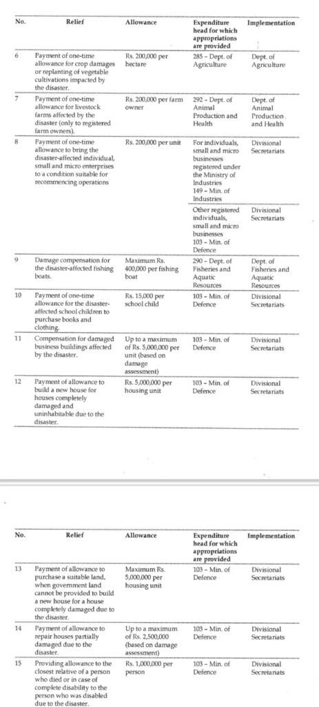 මෙම චක්‍රලේඛය මගින් නිවාස, ජීවනෝපායන්, කෘෂිකර්මාන්තය සහ නැවත ගොඩනැගීමේ සහාය සඳහා එක් වරක් ලබාදෙන දීමනා රැසක් පිළිබඳව සඳහන් කරයි.