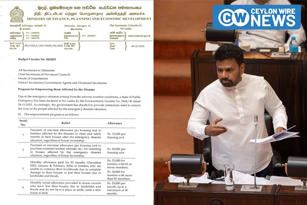 ‘දිත්වා’ සුළිකුණාටු ව්‍යසනයෙන් පීඩාවට පත් පවුල් සඳහා ලබාදෙන මූල්‍ය ආධාර සඳහන් කරමින් මුදල් අමාත්‍යාංශය විසින් අයවැය චක්‍රලේඛ අංක 08/2025 නිකුත් කර ඇත.