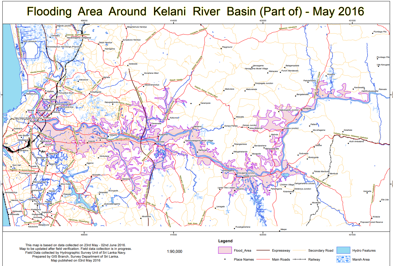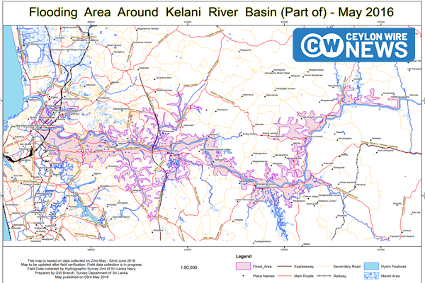 2016 කැළණි ගංගා ද්රෝණියේ පැතිර ගිය මහා ගංවතුර තත්ත්වය දැක්වෙන සිතියමක් මේ වන විට ජනමාධ්ය ඔස්සේ සංසරණය වෙමින් පවතින අතර, අඛණ්ඩ අධික වර්ෂාපතනය සහ තීව්ර කාලගුණික රටාවන් හේතුවෙන් මෙවර ජල මට්ටම් ඉහළ යාම වඩාත් වේගවත් හා පුළුල් විය හැකි බවට නිලධාරීහු අනතුරු අඟවති.