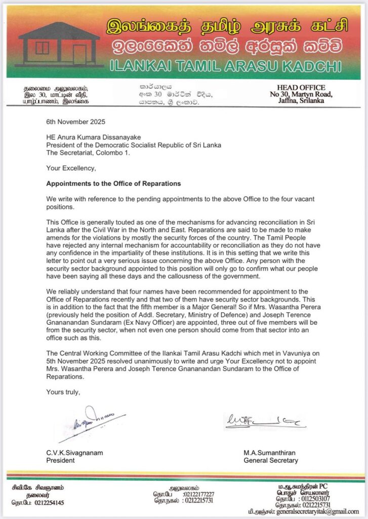 ‘X’ හි සටහනක දී පාර්ලිමේන්තු මන්ත්රී ශානකියන් පැවසුවේ, හිටපු හමුදා සහ ආරක්ෂක නිලධාරීන් වන්දි ගෙවීමේ කාර්යාලයට පත් කිරීමට එරෙහිව ඉලංකෙයි තමිල් අරසු පක්ෂය ජනාධිපති අනුර කුමාර දිසානායකට ලිපියක් යවා ඇති බවයි.