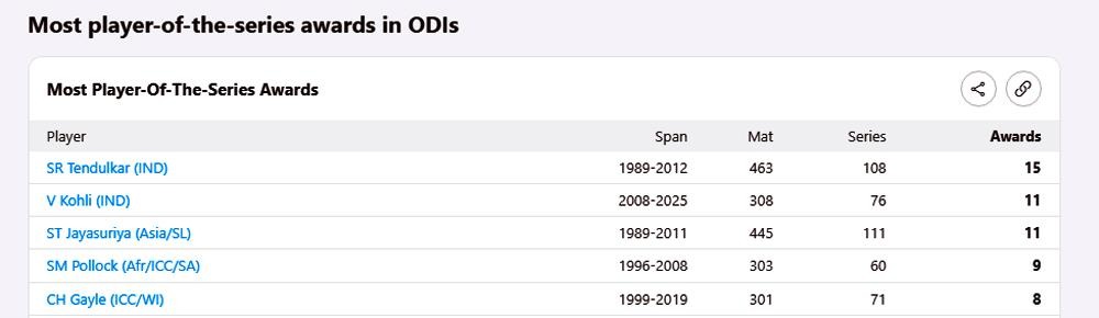 එක්දින තරග ඉතිහාසයේ දෙවැනි වැඩිම ‘තරඟාවලියේ දක්ෂතම ක්රීඩකයා'(Player of the Series) සම්මානය ලබාගත් ක්රීඩකයන් අතර දෙවැනි ස්ථානයට පත්වෙමින්, එම ස්ථානයේ මීට පෙර සිටි සනත් ජයසූරිය අභිබවා යෑමට විරාට් කෝලි සමත් විය.