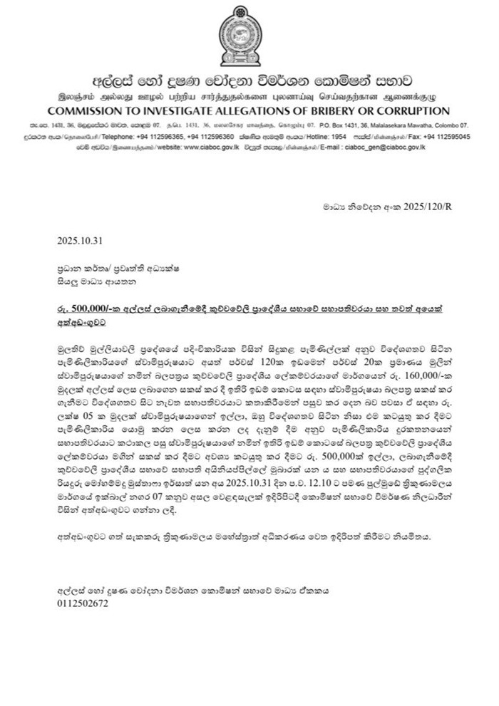 කුච්චවේලි ප්රාදේශීය සභාවේ සභාපති අයිනියා පිල්ලේ මුබාරක් (50) සහ ඔහුගේ පෞද්ගලික රියදුරු එම්.එම්. ඉර්ෂාඩ් (34) යන අය ඉඩම් බලපත්රයක් නිකුත් කිරීම සඳහා රුපියල් 500,000 ක අල්ලසක් ලබාගැනීමේ චෝදනාව මත අල්ලස් හෝ දූෂණ චෝදනා විමර්ශන කොමිෂන් සභාවේ නිලධාරීන් විසින් අත්අඩංගුවට ගෙන තිබේ.