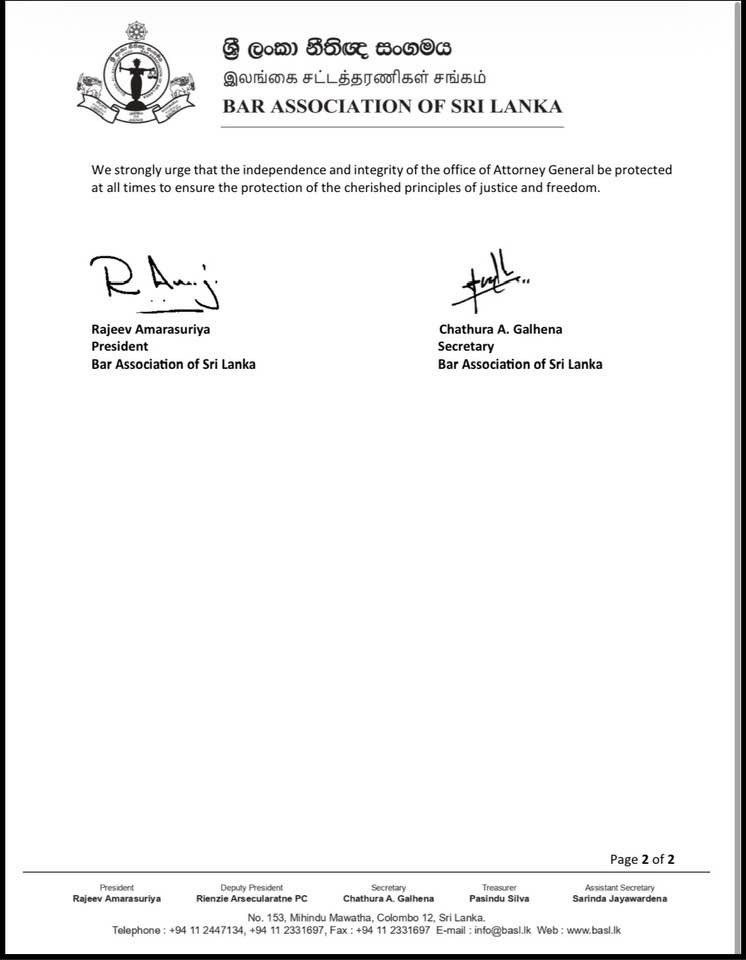 අවසාන වශයෙන්, නීතිපති කාර්යාලයේ නිලධාරීන්ට එල්ල වන අනවශ්ය බලපෑම් සහ බාධා කිරීම් වැළැක්වීමට රජය සහ නීතිය බලාත්මක කරන ආයතන වහාම පියවර ගත යුතු බව ශ්රී ලංකා නීතිඥ සංගමය ඉල්ලා සිටියි. දේශපාලනික හෝ පටු අරමුණු ඉටුකර ගැනීම සඳහා රාජ්ය ආයතනවල ස්වාධීනත්වය පාවා නොදිය යුතු බව එහි වැඩිදුරටත් සඳහන් වේ.