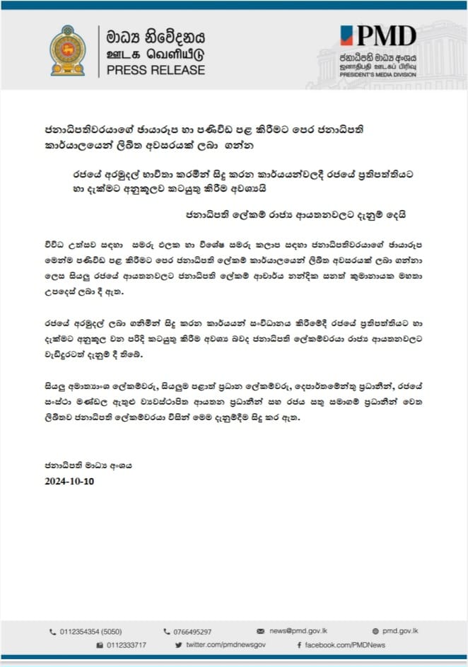විවිධ උත්සව සඳහා සමරු ඵලක හා විශේෂ සමරු කලාප සඳහා ජනාධිපතිවරයාගේ ඡායාරූප මෙන්ම පණිවිඩ පළකිරීමට පෙර ජනාධිපති ලේකම් කාර්යාලයෙන් ලිඛිත අවසරයක් ලබාගන්නා ලෙස සියලු රජයේ ආයතනවලට ජනාධිපති ලේකම් ආචාර්ය නන්දික සනත් කුමානායක උපදෙස් ලබා දී ඇත.