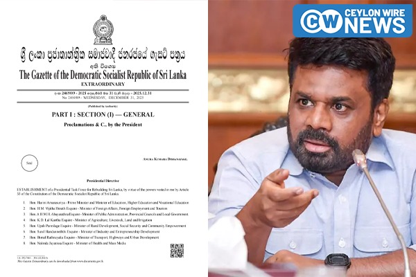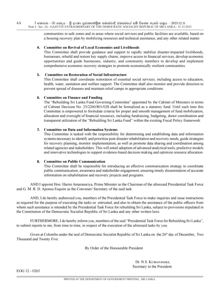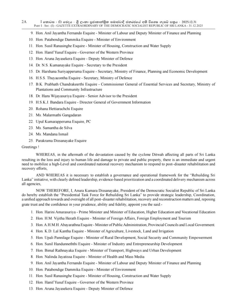 දිට්වා සුළි කුණාටුවෙන් ඇති වූ විනාශයෙන් පසු පශ්චාත් ආපදා පුනරුත්ථාපන, ප්රතිසංස්කරණ සහ ප්රතිසංස්කරණ කටයුතු සම්බන්ධීකරණය කිරීම අරමුණු කරගත් Rebuilding Sri Lanka ජනාධිපති කාර්ය සාධක බලකායක් ස්ථාපිත කරමින් ජනාධිපති අනුර කුමාර දිසානායක විසින් අතිවිශේෂ ගැසට් පත්රයක් නිකුත් කර ඇත.