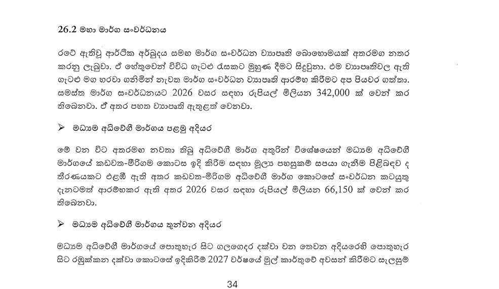 මධ්‍යම අධිවේගී මාර්ගයේ කඩවත-මීරිගම කොටස ඉදිකිරීම සඳහා මූල්‍ය පහසුකම් සැපයීමට රජය තීරණය කර ඇත. සංවර්ධන කටයුතු දැනටමත් ආරම්භ කර ඇති අතර, 2026 වසර සඳහා රජය රුපියල් මිලියන 66.150ක් වෙන් කර ඇත.