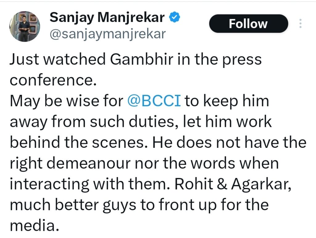 ඉන්දීය ක්රිකට් කණ්ඩායමේ ප්රධාන පුහුණුකරු වන ගෞතම් ගාම්භීර් ප්රවෘත්ති සාකච්ඡා සඳහා නොයැවීම සුදුසු හිටපු ඉන්දීය ක්රිකට් ක්රීඩක සංජේ මන්ජේකාර් ප්රකාශ කර තිබේ.