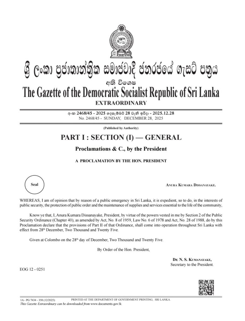 ජනාධිපති ලේකම් එන්.එස්. කුමානායක විසින් නිකුත්කර ඇති එම අතිවිශේෂ ගැසට් නිවේදනයේ දැක්වෙන්නේ, ශ්‍රී ලංකාවේ මහජන හදිසි අවස්ථා තත්ත්වයක් පැවතීම හේතු කොටගෙන මහජන ආරක්ෂාව සහ රටේ යථා පැවැත්ම සුරක්ෂිත කිරීම හා මහජන ජීවිතයට අත්‍යවශ්‍ය සැපයීම් හා සේවා පවත්වා ගෙන යෑම සඳහා මෙම මහජන හදිසි අවස්ථාවක් ප්‍රකාශයට පත්කරන බවයි.