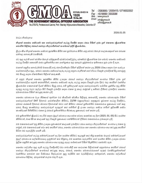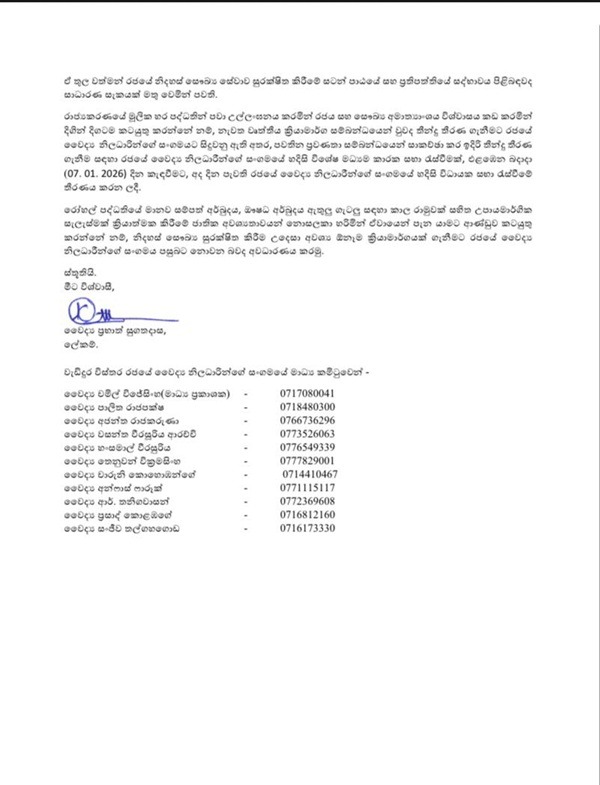 ශ්රී ලංකාවේ නිදහස් සෞඛ්ය සේවාව ආරක්ෂා කිරීම ජාතික වගකීමක් බව අවධාරණය කළ සංගමය, වෛද්යවරුන් සම්බන්ධ කාරණා, මානව සම්පත් හිඟය සහ ඖෂධ සැපයුම් අර්බුද වැනි පද්ධතිමය ගැටළු නොසළකා හැරීම නව වෘත්තීය සමිති ක්රියාමාර්ගයකට තුඩුදිය හැකි බවට අනතුරු අඟවා තිබේ.