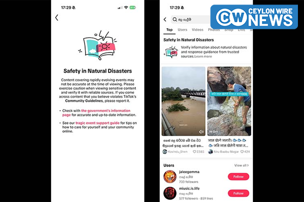ඒ අනුව TikTok වේදිකාවේ ගංවතුර ආශ්රිත යාවත්කාලීන කිරීම් සොයන ශ්රී ලංකාවේ පරිශීලකයන්ට දැන් විශ්වාසදායක මූලාශ්ර හරහා තොරතුරු සත්යාපනය කරන ලෙස ඉල්ලා සිටින ප්රමුඛ බැනරයක් පෙනෙනු ඇත.